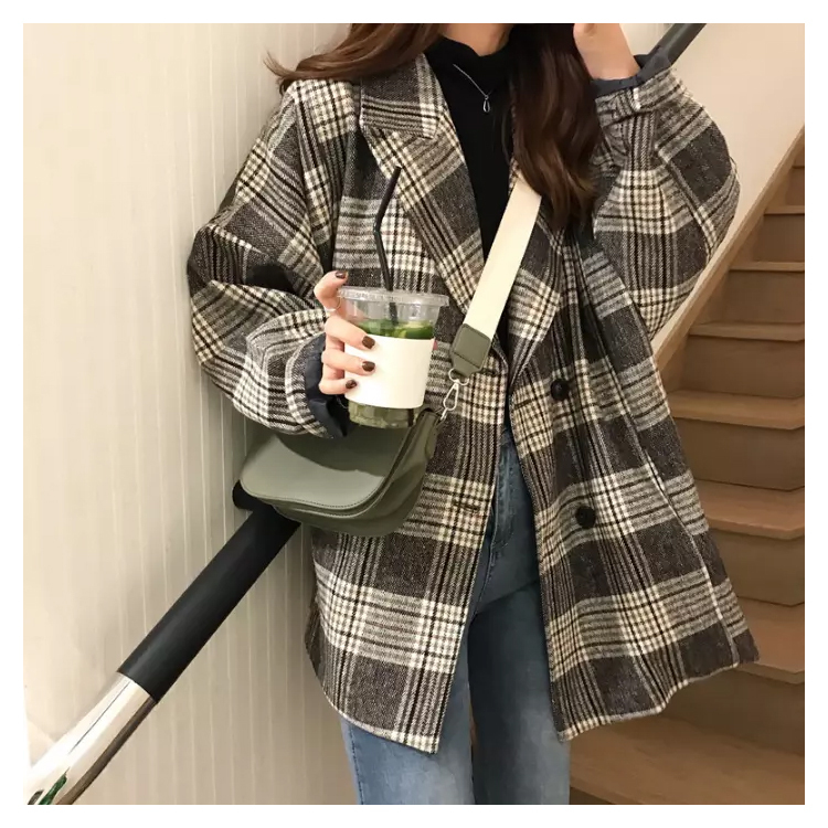 韩版女装宽松复古格纹毛呢外套长袖西装领呢子大衣